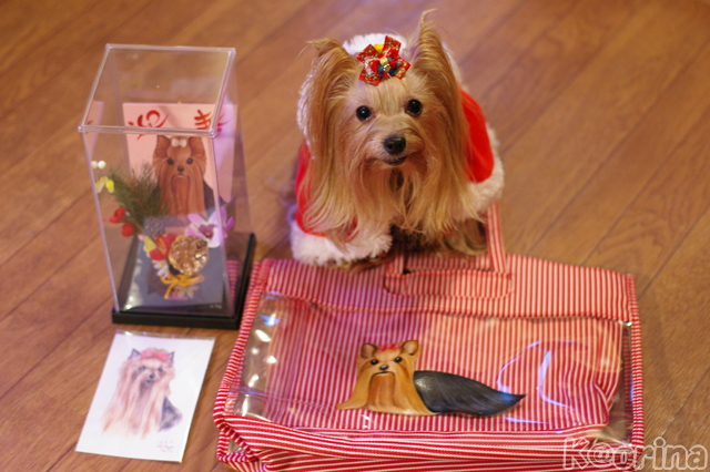 これ↓は、久し振りにネットで買った【ヨーキーグッズ】です。手描きの一品物のバッグと、羽子板。