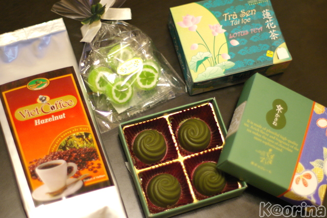ベトナムの珈琲と蓮花茶。京都の抹茶チョコレートと四つ葉のクローバーの飴を、