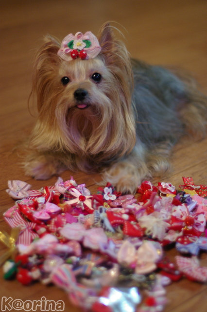 三人官女は、赤ちゃんヨーキーで、三段飾りになっています。